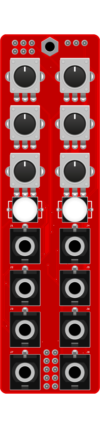 6MIX is a six channel DC coupled utility mixer, for mixing audio or CV signals. It is split in two groups of three channels, both with their respective mute buttons. Group 1 is normaled to group 2 so you can use it as a 1x6 channel mixer. A header on the back allows you to chain multiple units for even more inputs.