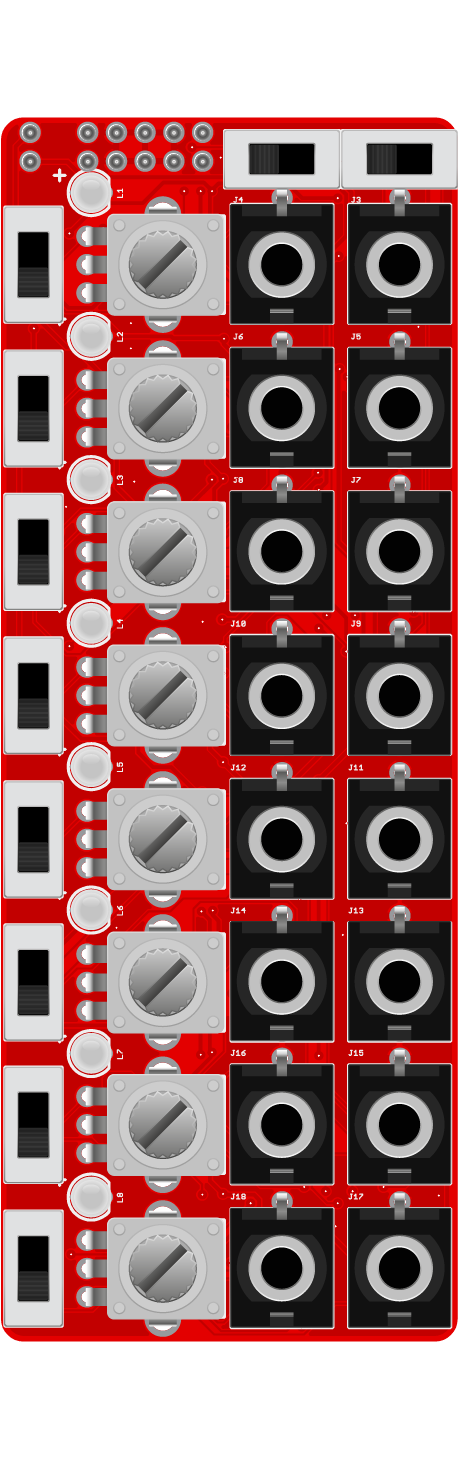 ATN8 is an eight channel signal processor. It can be used as an attenuator, attenuverter, offset generator, mixer and CV source. A bicolor LED accompanies each channel to provide visual feedback of the output level. Each channel is normaled to the next one so it can be used as a mixer as well. If there's no input on a channel, a selectable 5 or 10V is normaled to the input, these can be selected in two groups of four with the switches on top. There are switches for each channel to select between unipolar or bipolar modes.